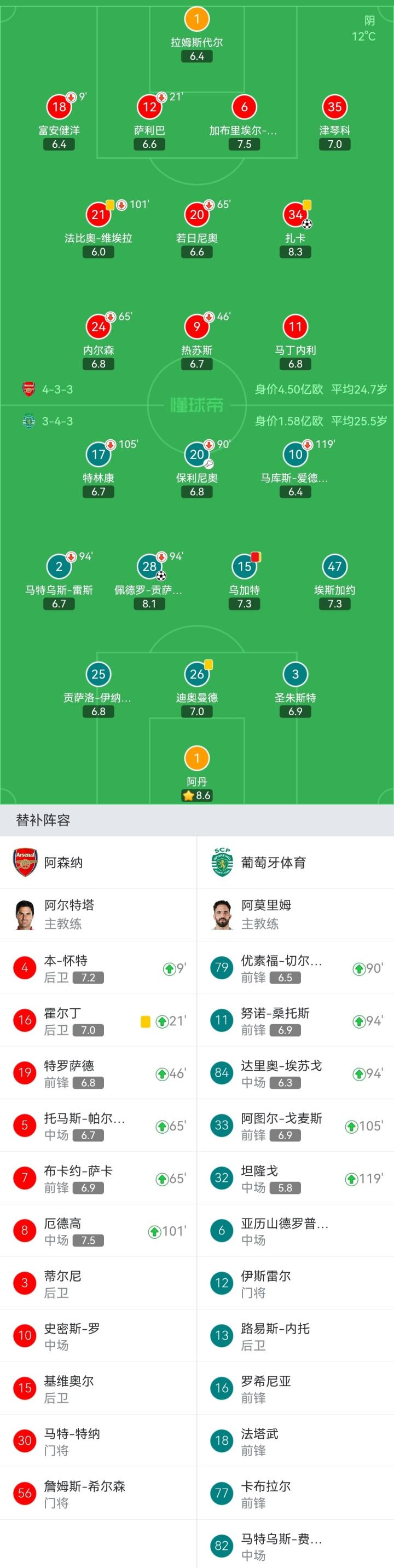 阿森纳首发:1-拉姆斯代尔、18-富安健洋(9'4-本-怀特)、12-萨利巴(21'16-霍尔丁)、6-加布里埃尔-马加良斯、35-津琴科、20-若日尼奥(65'5-托马斯-帕尔特伊)、34-扎卡、21-法比奥-维埃拉(101'8-厄德高)、24-内尔森(65'7-布卡约-萨卡)、11-马丁内利、9-热苏斯(46'19-特罗萨德)