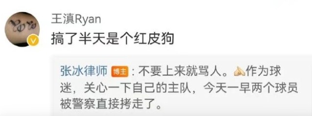 随后,该博主在社交媒体上转发了律师张冰的一条微博评论。微博上有人质疑律师张冰为海港球迷,并使用了侮辱语言。张冰回应:“不要上来就骂人。作为球迷,关心一下自己的主队,今天一早两个球员被警察直接拷走了。”
