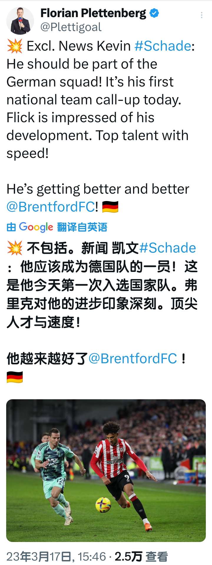 看看准不准,普莱滕贝格消息,布伦特福德边锋沙德将会入选德国国家队