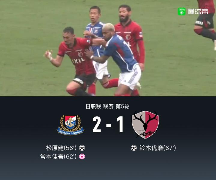 横滨水手2-1鹿岛鹿角,结束两轮不胜,松原健、铃木优磨建功