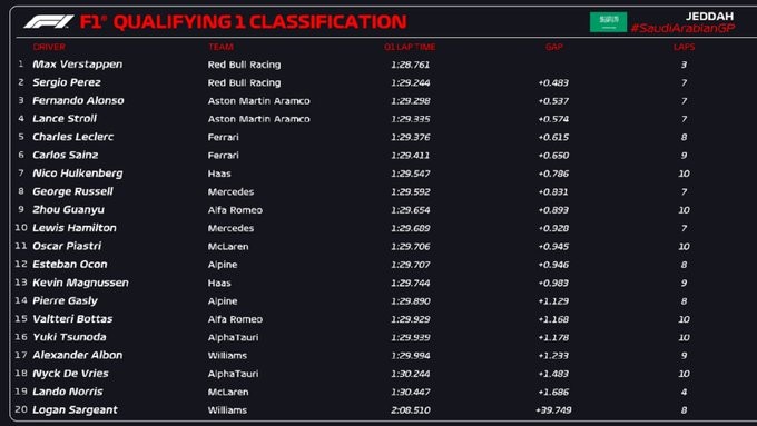 最终,Q1停表,被淘汰的车手有:角田裕毅、阿尔本、德弗里斯、诺里斯、萨金特。