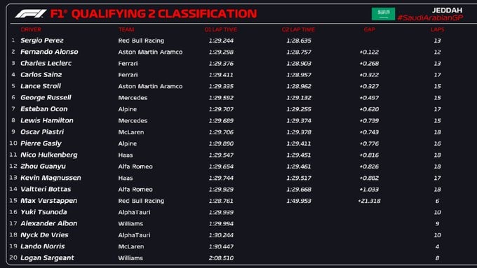 最终,Q2停表,被淘汰的车手有:维斯塔潘、博塔斯、马格努森、周冠宇、霍肯博格。