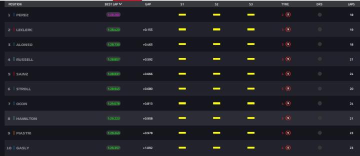 第一个飞行圈结束后,排名前三的是佩雷兹、勒克莱尔和拉塞尔。