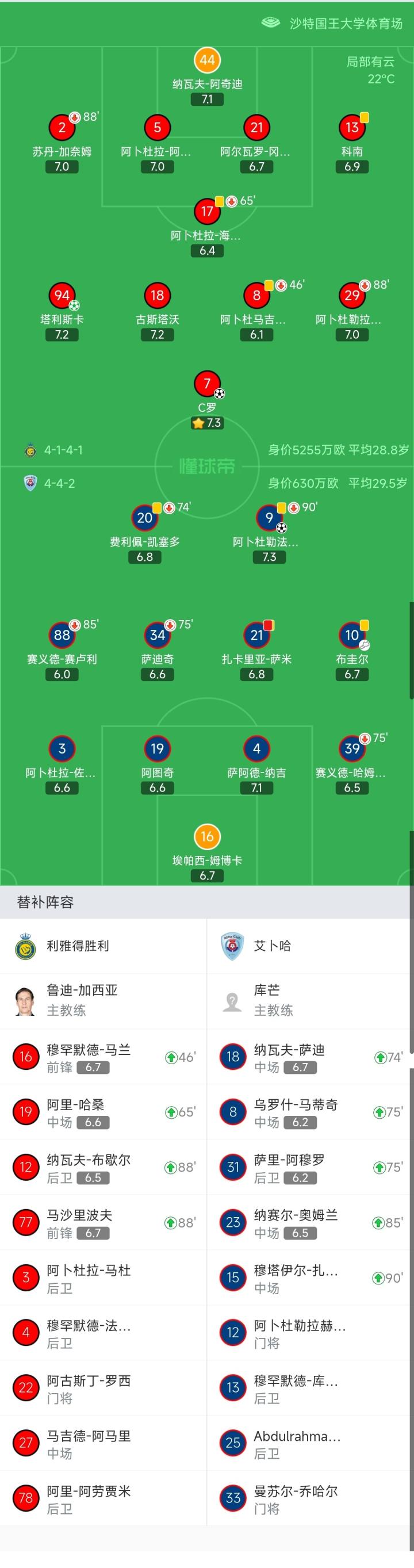 利雅得胜利首发:44-纳瓦夫-阿奇迪、2-苏丹-加奈姆(88′12-纳瓦夫-布歇尔)、5-阿卜杜拉-阿姆里、21-阿尔瓦罗-冈萨雷斯、13-科南、18-古斯塔沃、8-阿卜杜马吉德-苏莱希姆(46′16-穆罕默德-马兰)、17-阿卜杜拉-海巴里(65′19-阿里-哈桑)、29-阿卜杜勒拉赫曼-加里卜(82′77-马沙里波夫)、94-塔利斯卡、7-C罗