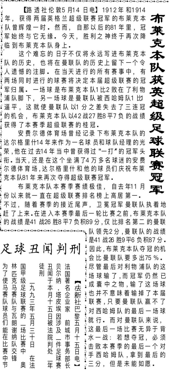 81年的守候:回顾94-95赛季布莱克本夺得英超冠军 (路透社伦敦5月14日电)1912年和1914年,获得两届英格兰超级联赛冠军的布莱克本队曾辉煌一时。然而,自那以后的81年里,冠军始终与它无缘。今天,胜利之神终于再次降临到布莱克本队身上。 这个难忘的日子不仅将永远写进布莱克本队的历史,也将在曼联队的历史上留下一个令人遗憾的注脚。在当天进行的所有赛事中,有两场同时进行的球赛将决定本届超级联赛的冠军归属。一场球是布莱克本队1比2 败在了利物浦队脚下,另一场球是曼联队被西哈姆队1比1逼平,这就使曼联队以1 分之差失去了三连冠的机会,布莱克本队以42战27胜8平7负的战绩获得了本赛季超级联赛的桂冠。 安费尔德体育场曾经记录下布莱克本队的达尔格里什14 年来作为一名球员和球队经理的光荣,他在过去14年当中曾获得过“一打”的冠军头衔。当天,还是在这个坐满了4万多名球迷的安费尔德体育场,达尔格里什和他的球员们庆祝布莱克本队81年来再次夺得超级联赛冠军。 布莱克本队本赛季赛绩极佳,自去年11月份以来就一直在超级联赛排名榜上高居第一。不过,随着赛季的接近尾声,卫冕冠军曼联队执着地赶了上来。在进入本赛季最后一轮比赛之前,布莱克本队的战绩是41战26胜8平7负积89分,仅比排名第二的曼联队领先2分,曼联队的战绩是41战26胜9平6负积87分。因此,布莱克本队夺冠的机会比曼联队要多出75%。尽管最后对利物浦队的这场球输了,而冠军仍然已成囊中之物,输了这场球也并不意味着输掉了本届联赛,只要曼联队赢不了对西哈姆队的最后一场球就行。而对曼联队来说,这最后一场比赛无异于背水一战:若想夺冠,必须击败本赛季的最后一个对手西哈姆队,拿到最后的三分,但是未能如愿。 (1995年5月17日,参考消息)