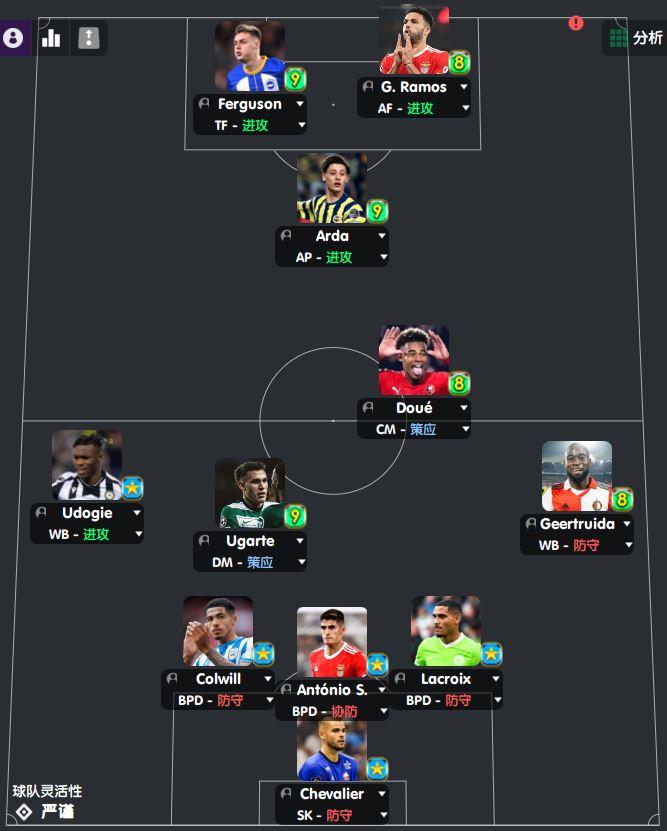 (图示战术及球员角色与现实无关,球员头像边数字为职责熟练度而非评分)