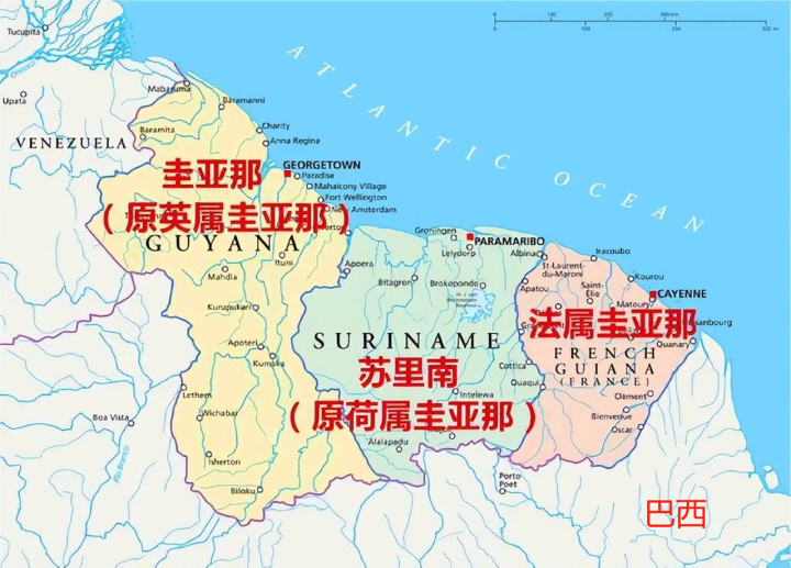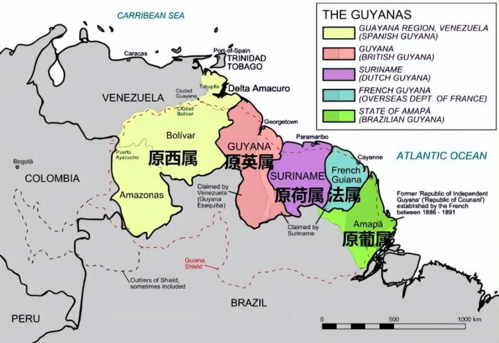 圭亚那一词源于当地的土著语,意为水乡。哥伦布发现美洲大陆后,美洲被列强瓜分。其中,圭亚那地区被英国、荷兰、法国、西班牙和葡萄牙五国瓜分。