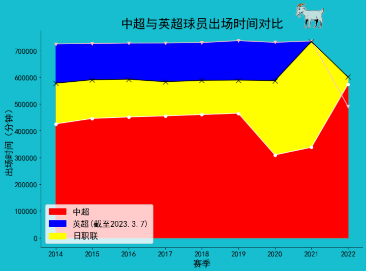 图一、三个联赛球员总出场时间对比(英超数据截至2023年3月7日)