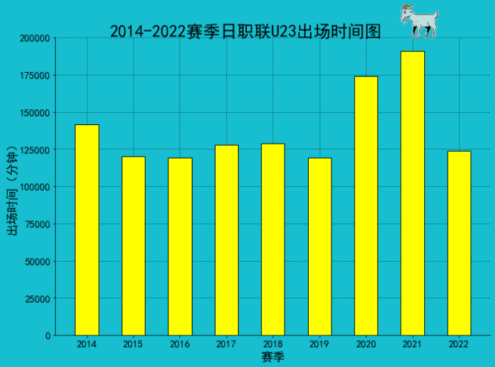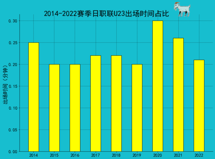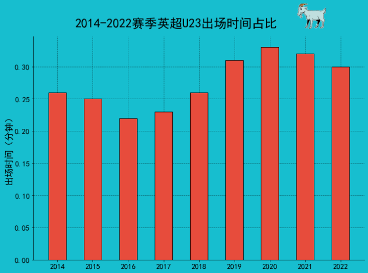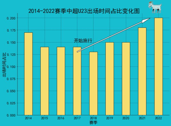 从出场时间占比图来看,整体呈上升趋势,U23球员的出场时间占比从2017赛季14.7%提升到了2022赛季的20%,政策的实施起到了增加U23球员出场时间的作用。