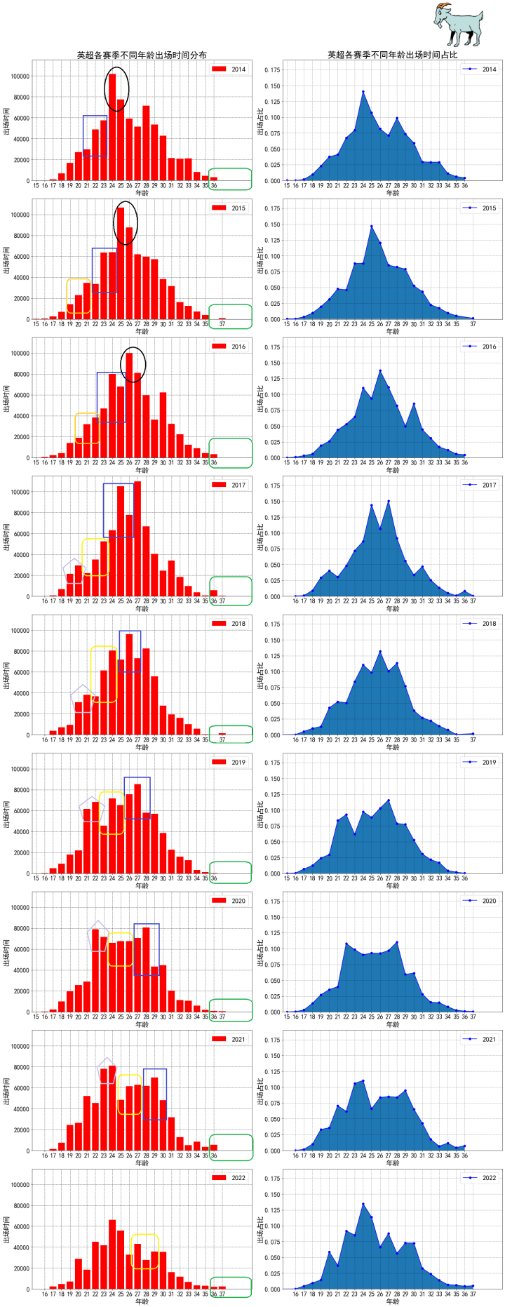 最后,通过右侧的时间占比图,我们可以发现英超的趋势是逐年向左侧(更年轻)移动,这也代表着英超进入了高度年轻化的状态,而本赛季阿森纳的崛起则可以视为英超年轻化所造就的高强度和高速度的成功代表。