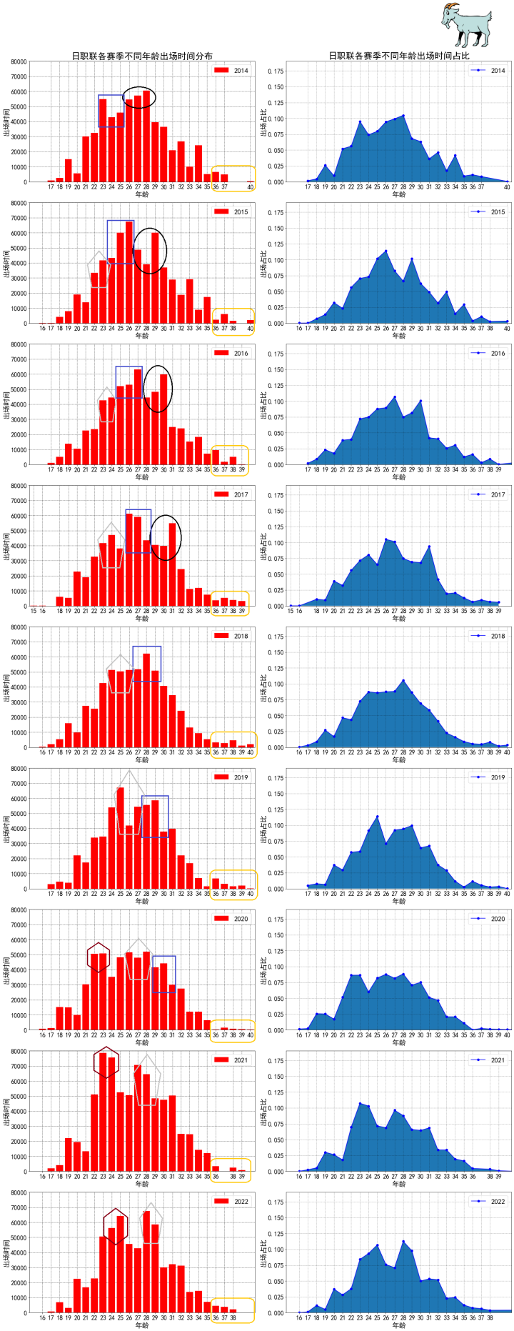 此区域标注的是2014赛季时处在24-26岁球员出场时间的变化情况,可以看到,这一批人基本统治了自2014到2021赛季这8年的联赛出场时间榜单,在这期间他们基本都占据了每年出场时间榜前三的位置。