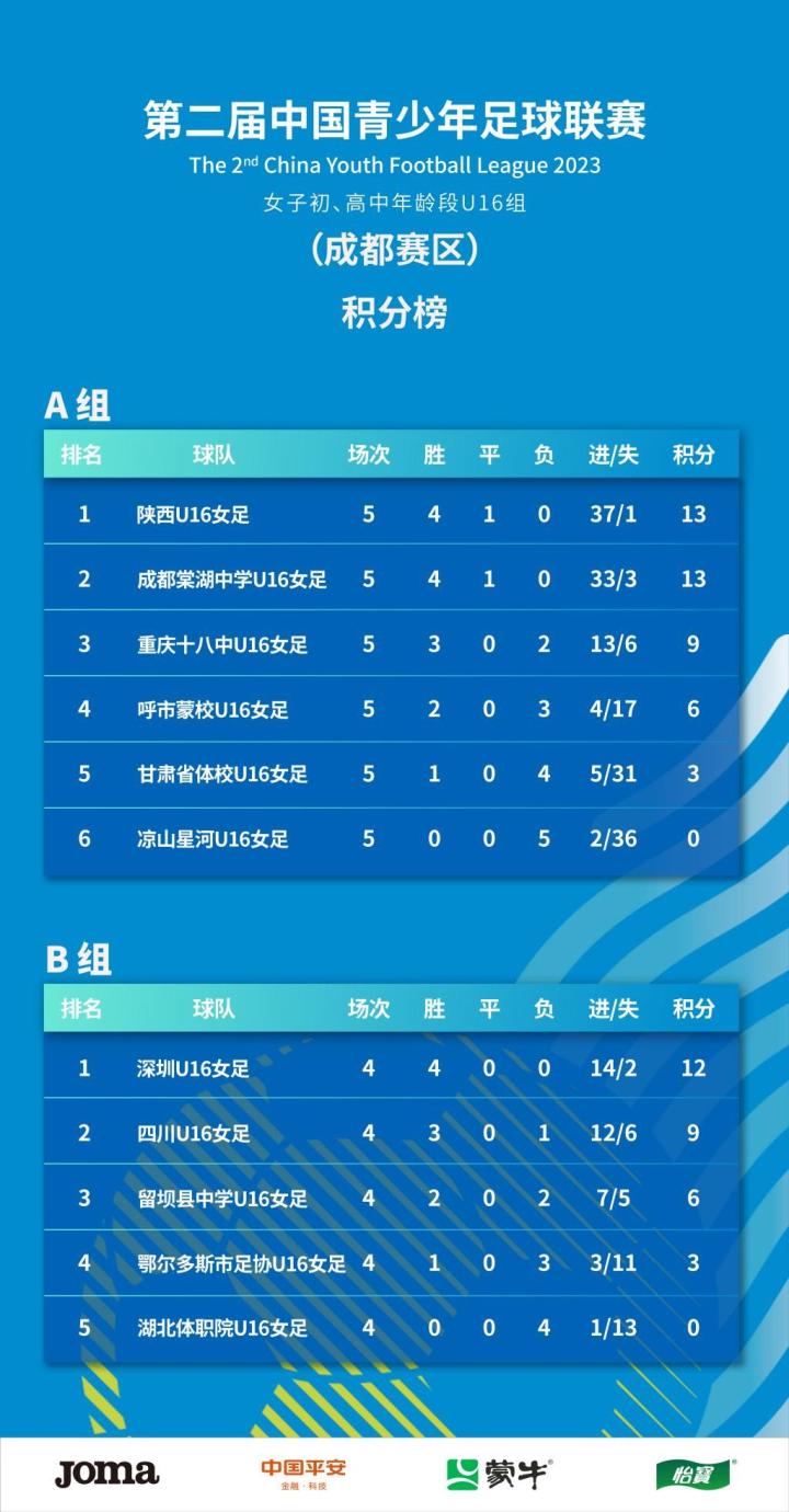 来自中国足协官网的消息,2023第二届中国青少年足球联赛女子初、高中年龄段U16组第一阶段比赛结束,包括陕西U16女足、深圳U16女足和江苏U16女足在内的共24支球队从小组出线,晋级第二阶段比赛。