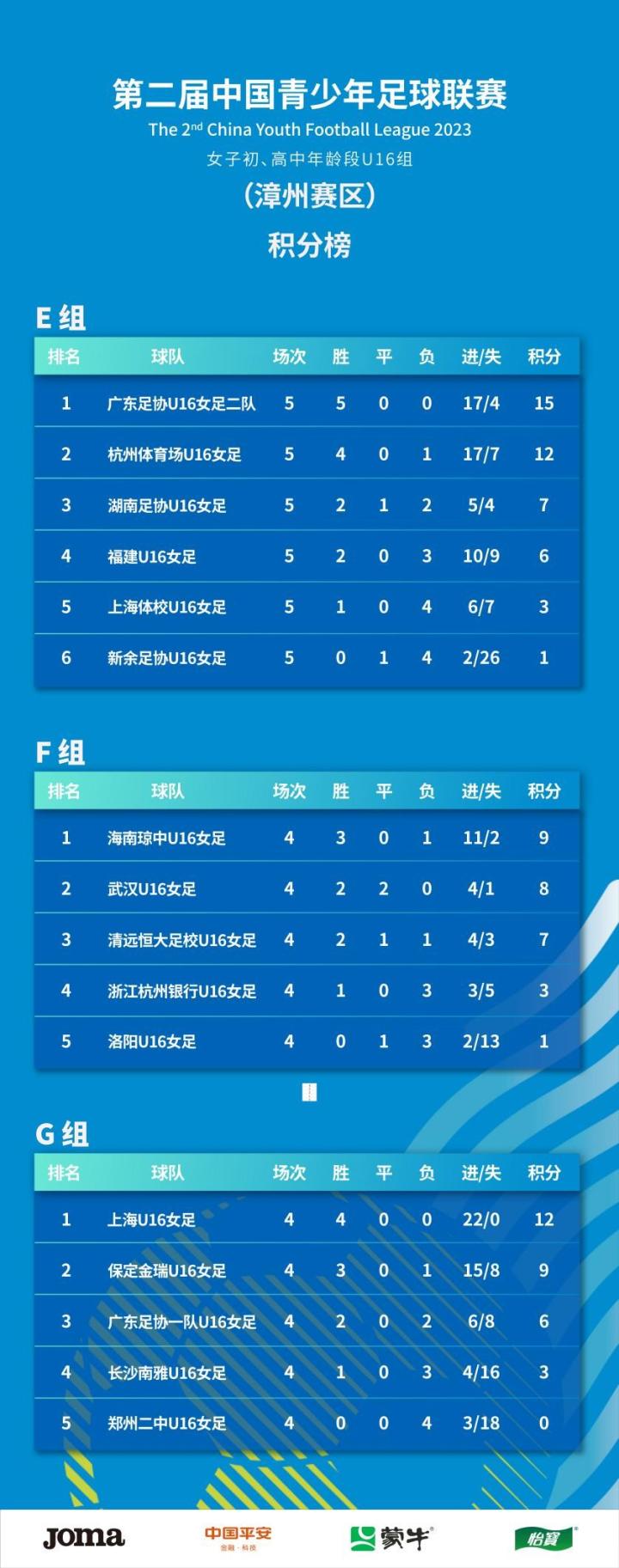 在最后一个小组G组比赛中,上海U16女足连续四场零失球,积12分排名小组第一。他们也和江苏U16女足一起成为本阶赛事中仅有的两支没有丢球的球队。保定金瑞U16女足、广东足协一队U16女足、长沙南雅U16女足、郑州二中U16女足分列第二到五名。