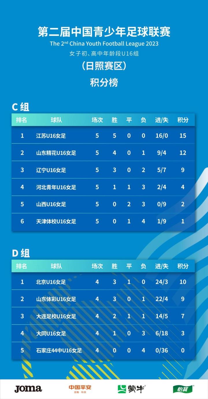 C组和D组的比赛是在山东日照赛区进行。C组中,江苏U16女足收获全胜,且在5场比赛中未失一球,体现出不俗实力,排名小组第一。山东精花U16女足、辽宁U16女足、河北青年U16女足、山西U16女足和天津体校U16女足排名二到六位。