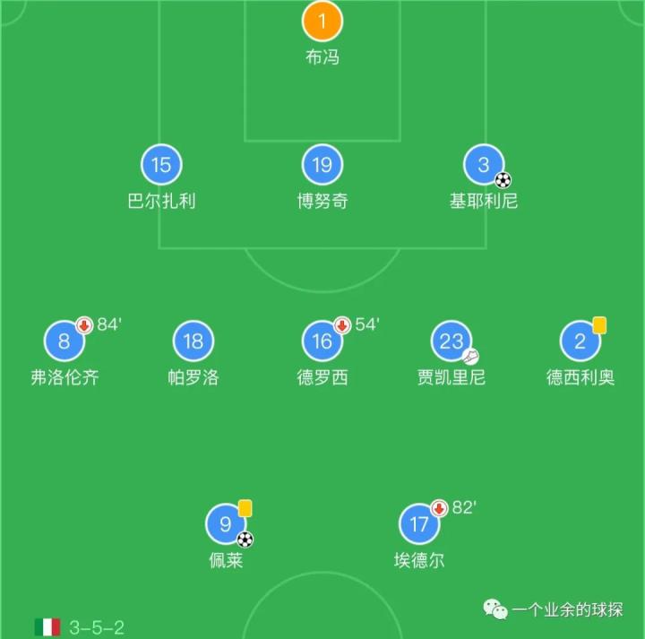 和曼城这一套以技术性和侧重控球能力的三中卫阵型形成鲜明对比的便是2016年欧洲杯上的由孔蒂带领的意大利国家队,配合意大利国家队传统的链式方式和强大的反击能力,孔蒂在球队的阵容相对的“平民化”的情况下成功的将一支相对“平民”的意大利队带到了1/4决赛,最后也只是惜败阵容更强的德国队。在那只意大利国家队中,左右的两个边翼卫:弗洛伦齐和德西利奥都是属于攻守兼备的相对传统的边后卫/边翼卫,防守的能力都较为出色的同时具备很好的上下往返能力,三个中卫的组合是意大利经典的BBC:巴尔扎利、博努奇和基耶利尼的组合,这三个人的中卫组合也是世界足坛过去的十几年中被普遍认可的最强的中卫组合之一,巴尔扎利和基耶利尼负责扫荡、补位和覆盖,博努奇负责居中的出球。中场三个人分工相当明确,德罗西负责拖后防守,那个赛季状态出色的贾凯里尼负责中场的拿球和推进,帕罗洛负责中场的覆盖和前插得分,锋线也是经典的一高一矮的佩莱和埃德尔的组合,佩莱强大的支点和头球能力很好的充当了一个“桩”的作用,埃德尔的机动性、射门能力很偏向于早年的皮耶罗和朱塞佩·罗西那样的意式二前锋,和中场活动自由度较高的贾凯里尼会有很多的呼应和换位。其实单看这个阵型搭配是一个非常经典和传统的352标准人员配置,但这套阵容的一个亮点就是意大利教练非常擅长的所谓“三个半”的战术思路。由于德西利奥是一名右脚打左路的逆足球员,同时自身的速度和对进攻的推进作用远不如对侧的弗洛伦齐,所以在实际的比赛站位中,德西利奥会更多的回到中位线和BBC组合形成一个四后卫的站位,只会在必要的时候适当的压上帮助边路的拿球,同时德西利奥有一脚非常出色的逆足传中能力,也可以和中路的佩莱形成很好的联系。弗洛伦齐则会充当一个更偏向于边翼卫的角色,进攻前压较大,防守也能退回来补充防线人数,对阵德国队的1/4决赛弗洛伦齐就有一次经典的门线脚后跟解围的经典场面。这支球队强大的执行力、防守的稳定性和反击的高效帮助意大利队连续击败比利时队和西班牙队这样的顶级的技术型球队,堪称意式防守反击的教科书案例。