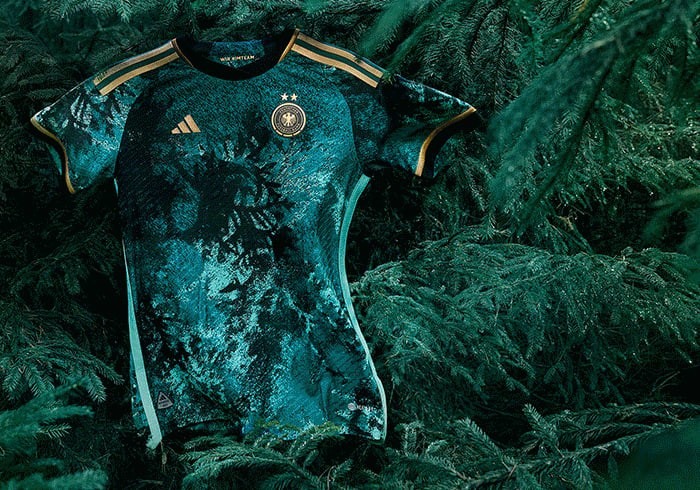 德国女足的球衣采用墨绿色搭配黑+金色镶边的配色方案,球衣全身花纹的灵感来源于覆盖德国全境32%面积的森林地带,做出了树枝、树叶交错的明暗效果。