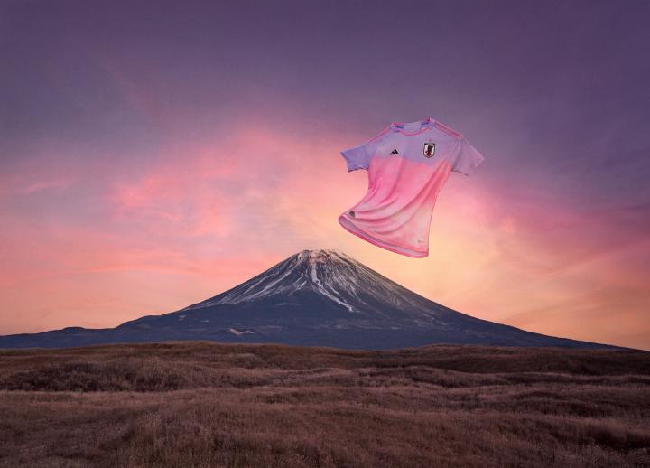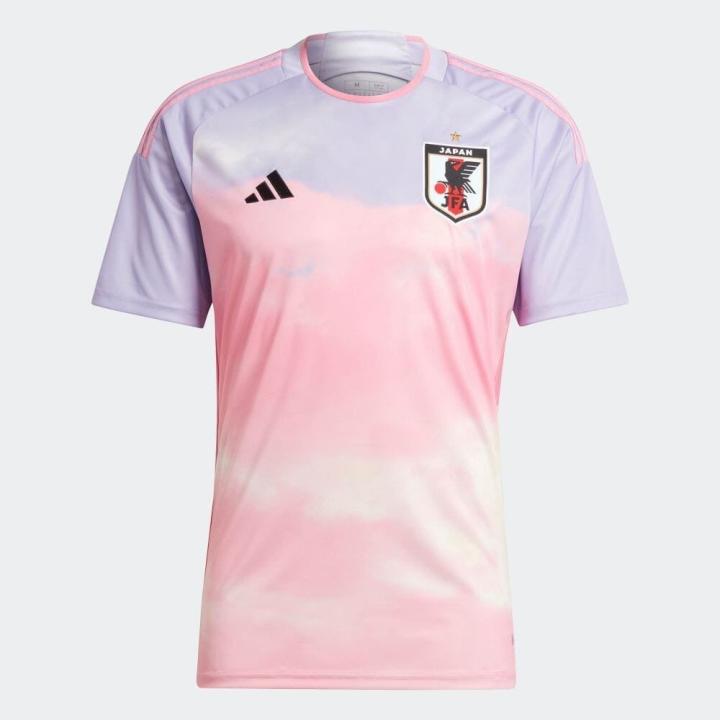 一件十分有辨识度的球衣,日本女足客场采用了淡紫色+粉色+白色的渐变式撞色设计,与富士山落日余晖时的景象完美融合,也是女足所独有的配色方案。
