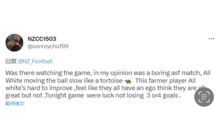 一些新西兰球迷的评论:巴泽利out!史密斯应该登...莱斯特城的小狐狸 @懂球帝2023-03-24 01:18一些新西兰球迷的评论: 巴泽利out! 史密斯应该登上中国的飞机跟他们回去! 你们进攻推进像乌龟爬 很庆幸没有输三个球!展开更多