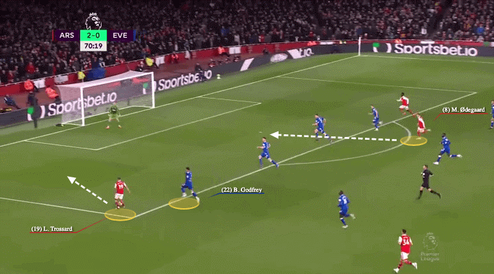 这里我们能看到特罗萨德的另一个闪光点 – 他的速度。他的速度加上他的提前启动在这次进攻当中已经甩掉了戈佛雷,但是最令人激动的是他在全速冲刺的情况下,没有中断步幅,起脚低平球倒三角找到了插上的厄德高。