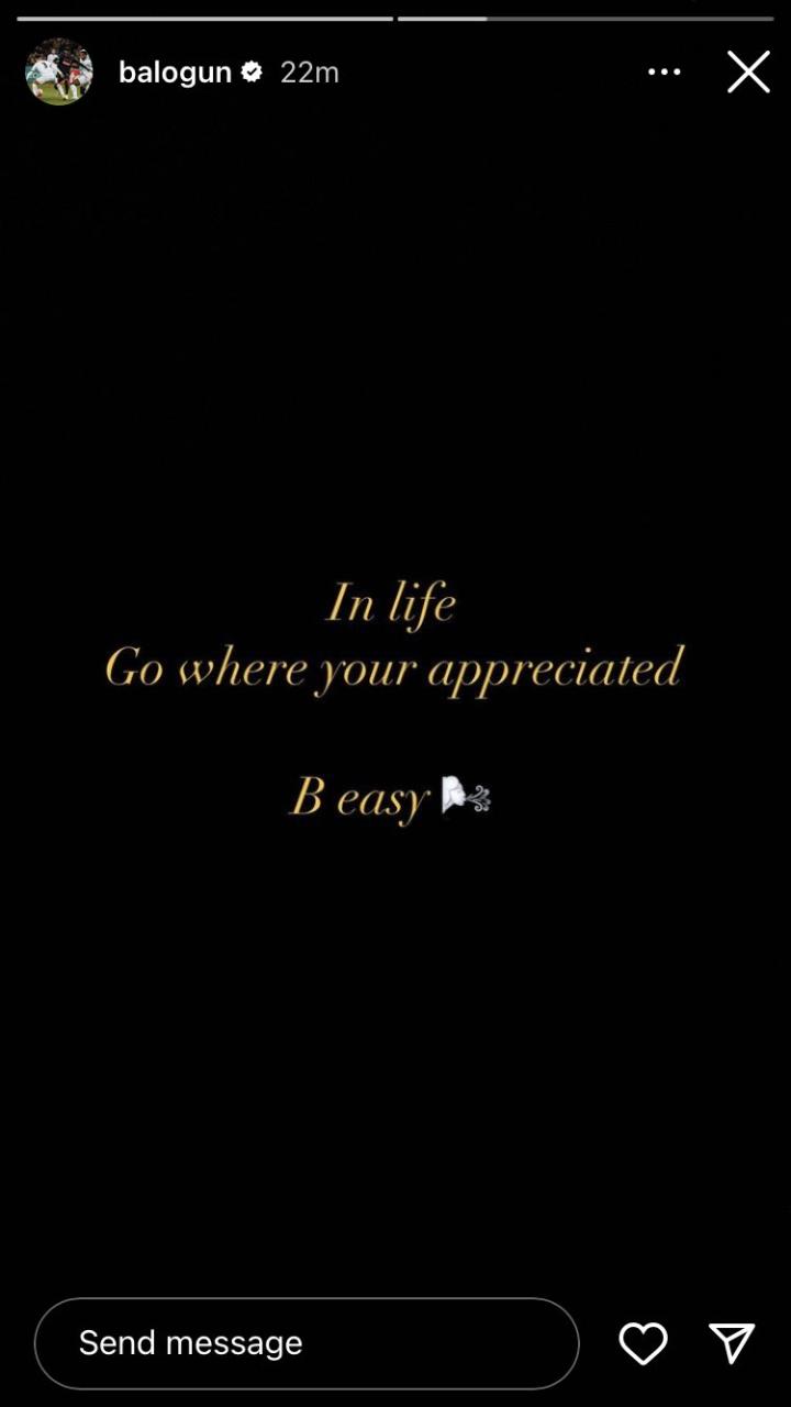 巴洛贡上周在落选英格兰新一期的成年队大名单后意味深长地发送了一条动态,他表示:“在生活中,去那些(你)被欣赏的地方。”