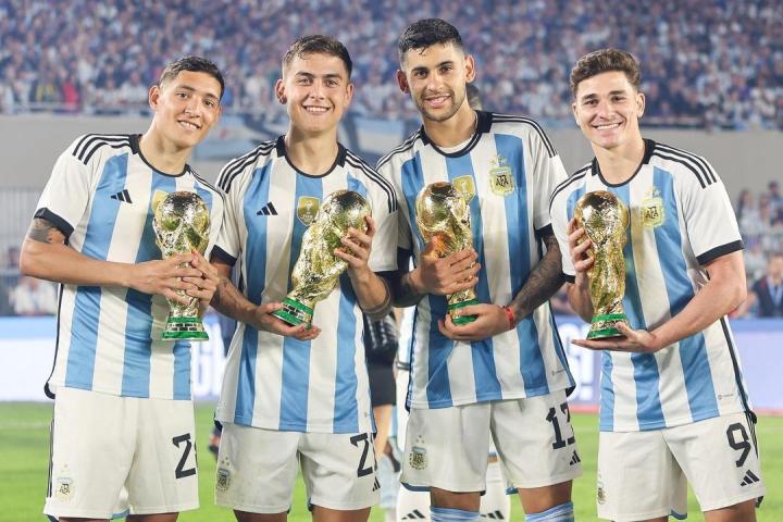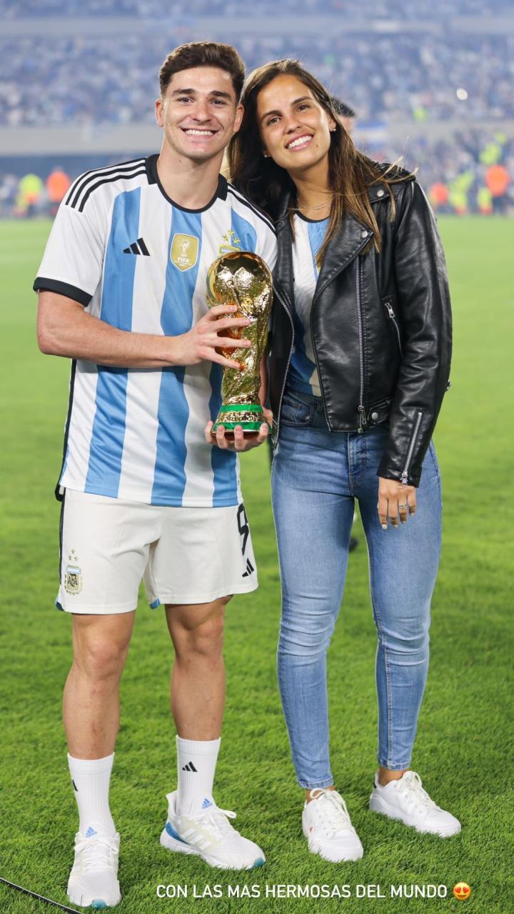 阿尔瓦雷斯晒与女友合影:和世界上最美丽的女人在一起ETChalmers @懂球帝2023-03-24 20:13曼城前锋阿尔瓦雷斯在社交媒体晒出他和女友在阿根廷夺冠庆祝活动上的合影。阿根廷队在纪念碑球场举办了世界杯夺冠庆祝活动,球员的家人们也到场参加。曼城前锋阿尔瓦雷斯晒出他捧着大力神杯和女友在场上的合影,并配文:“和世界上最美丽的女人在一起。”此外,阿尔瓦雷斯还晒出他和队友们的合照。展开更多