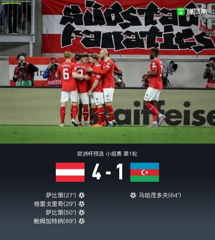 奥地利4-1阿塞拜疆,萨比策2射1传,鲍姆加特纳传射建功