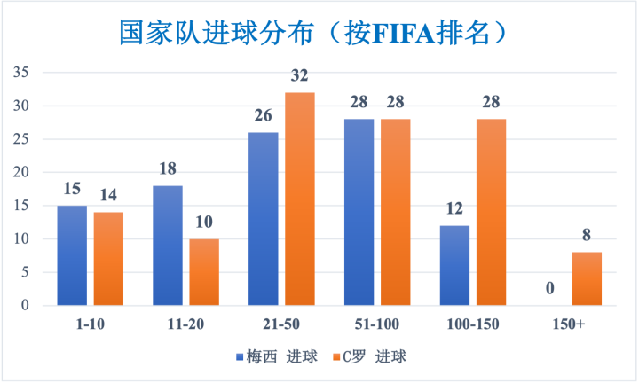 (图)梅罗在国家队进球分布(按对手在FIFA排名)