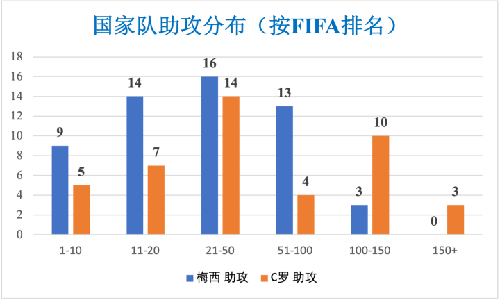 (图)梅罗在国家队助攻分布(按对手在FIFA排名)