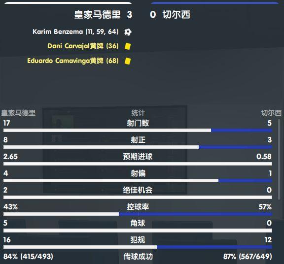 比赛结束,皇马在主场3-0完胜切尔西。