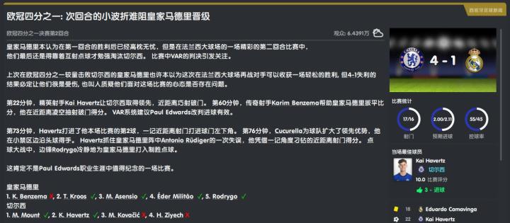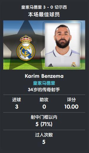 本场比赛的MVP是打进三球的哈弗茨,更多参与拖后策应的他发挥了自己的特点,也找回了进球运;恩佐·费尔南德斯贡献一次助攻,评分7.9。皇马阵中,打进一球的本泽马和替补上场的罗德里戈表现出色。