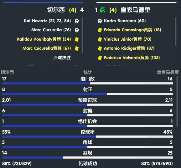 本场比赛可谓惊险刺激、跌宕起伏。切尔西没有在两度落后三球的情况下放弃希望,他们凭借哈弗茨的帽子戏法和库库雷利亚的头球,将比赛拖入点球大战。可惜最后两个点球接连射失,铁血蓝军最终还是被淘汰。皇马在次回合表现不佳,但他们靠经验稳住了局面,并在点球大战中获胜,有惊无险地闯入欧冠四强。