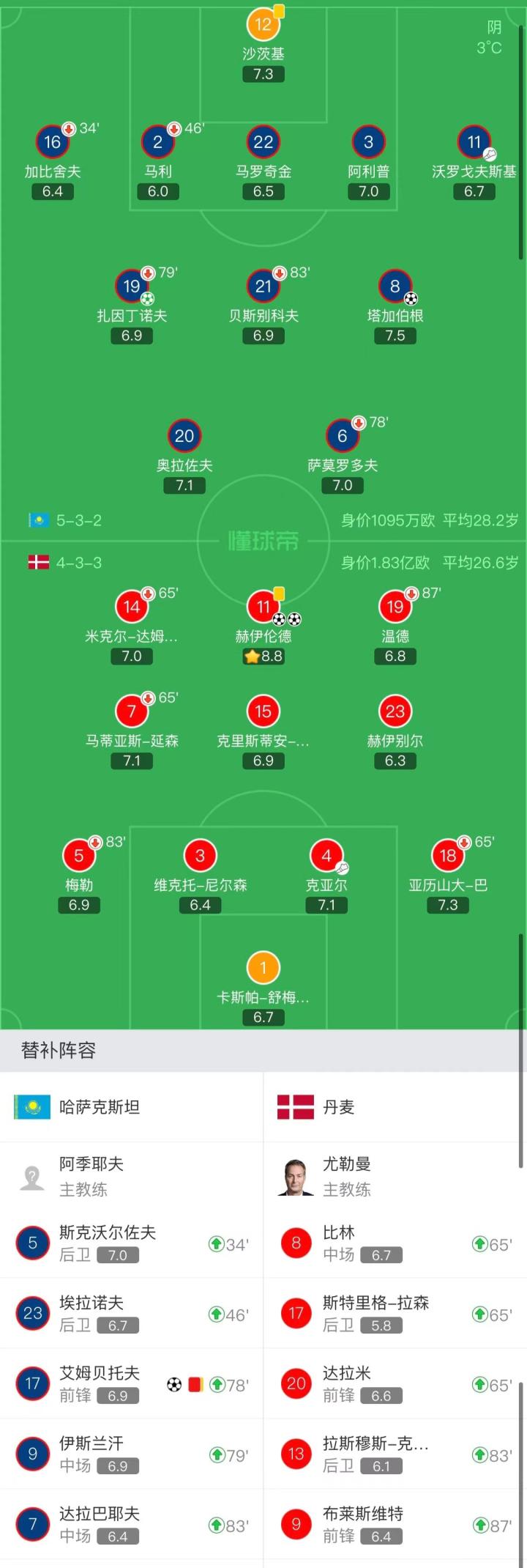 丹麦首发:1-舒梅切尔、5-梅勒(83'13-拉斯穆斯-克里斯滕森)、3-维克托-尼尔森、4-克亚尔、8-压力山大-巴(65'17-拉森)、7-延森(65'8-比林)、15-内尔高、33-赫伊别尔、19-温德(87'9-布莱斯维特)、11-赫伊伦德、14-米克尔-达姆斯高(65'20-达拉米)