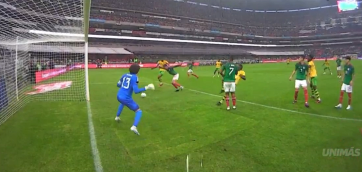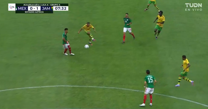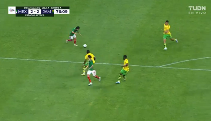 第70分钟,墨西哥18号路易斯·查韦斯送出长传,准确找到前场的队友,一脚横传到禁区前,刚上场的劳尔·希门尼斯不停球一脚劲射,球打在牙买加球员腿上弹出了底线。