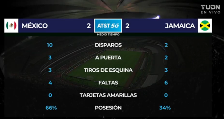 主裁判埃尔法思也随之吹响了上半场结束的哨音,双方带着2:2的平局回到更衣室。墨西哥10次射门3次射正,牙买加2脚射门就收获2个进球。