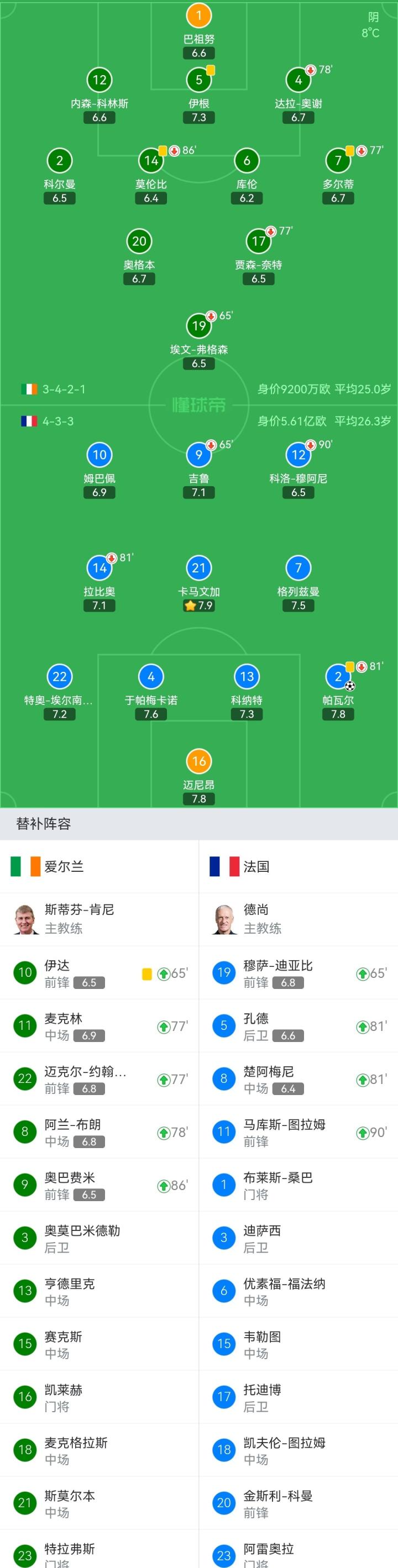 法国首发:16-迈尼昂、2-帕瓦尔(81'5-孔德)、13-科纳特、4-于帕梅卡诺、22-特奥-埃尔南德斯、21-卡马文加、14-拉比奥(81'8-楚阿梅尼)、7-格列兹曼、12-科洛-穆阿尼(90+2'11-马库斯-图拉姆)、10-姆巴佩、9-吉鲁(65'19-穆萨-迪亚比)