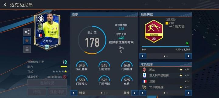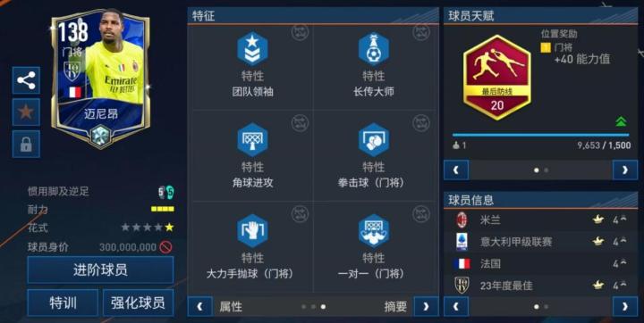 实战中的迈尼昂强化了大力手抛球特性,传球能力被进一步加强。他的门线反应能力与选位能力是顶级的,进攻属性几乎被点满。他是后防线的司令塔,可以指导防线队友跑位,同时他也会自动补住防线的空档,是整体防御的高手。