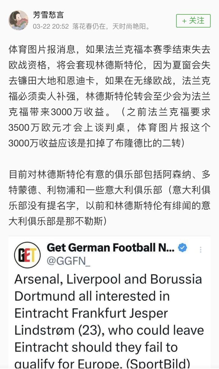 来自CM的报道,阿森纳已经联系了法兰克福球员林德...北伦敦小酒馆 @懂球帝2023-03-29 07:59来自CM的报道,阿森纳已经联系了法兰克福球员林德斯特伦的团队,同时也与法兰克福俱乐部进行了接触。阿森纳希望以3000万左右欧元的价格引进。 但是阿森纳还面临另外3-4家球队的竞争,该媒体没有披露。 综合整理来自法兰克福博主@芳雪愁言 的相关报道,阿森纳竞争对手可能是利物浦。展开更多