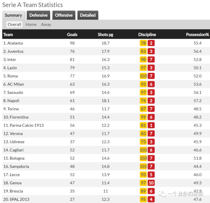(2019/2020赛季意甲球队进球数排行,亚特兰大以98球遥遥领先)