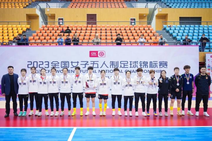 中国足球协会女子五人制国家队主教练胡杰、百色市文化广电体育和旅游局副局长王丰景为亚军队伍宁夏恒利俱乐部颁奖。