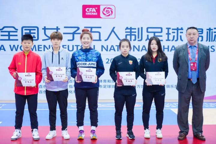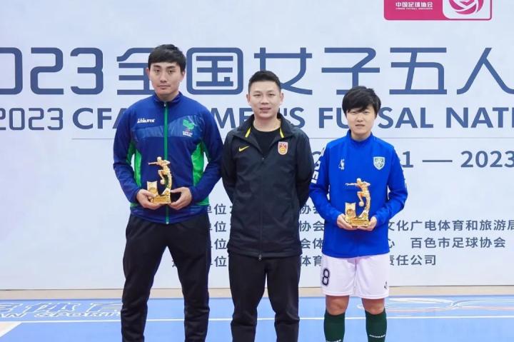 中国足球协会女子五人制国家队主教练胡杰为“优秀教练员”上海华正-战慧敏、江西师范大学-郑磊颁奖。