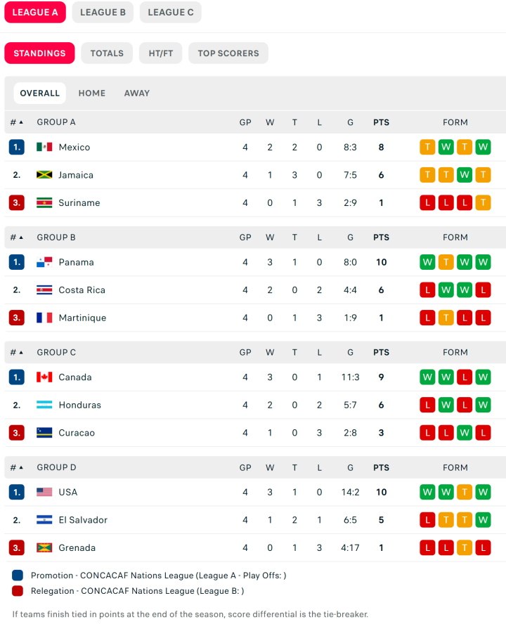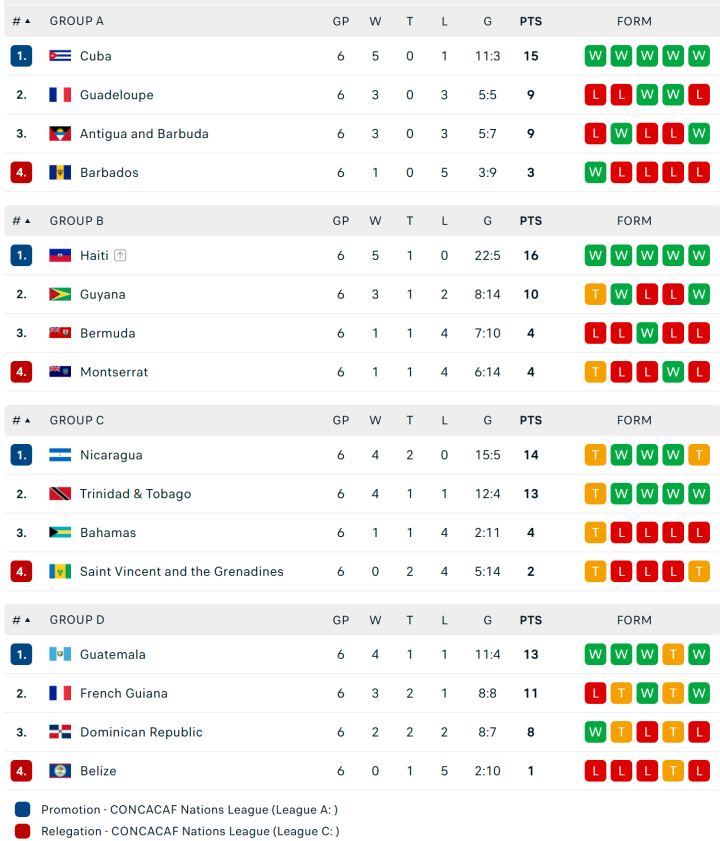 目前中北美国家联赛的各级别联赛小组赛已经全部结束。按照最终的排名,直接晋级中北美金杯赛正赛的球队有:AA组的墨西哥、牙买加;AB组的巴拿马、哥斯达黎加;AC组的加拿大、洪都拉斯;AD组的美国、萨尔瓦多;BA组的古巴、BB组的海地、BC组的尼加拉瓜、BD组的危地马拉。