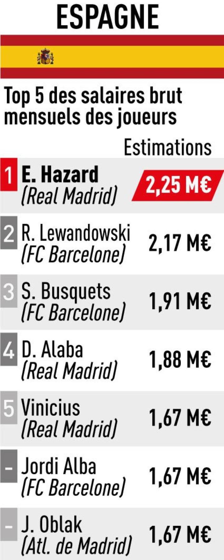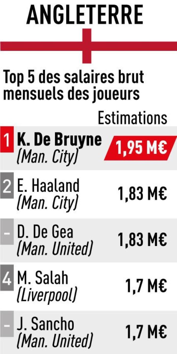 《队报》披露了五大联赛各大联赛球员薪水排行,英超球员中德布劳内最高,西甲球员中阿扎尔最高。
