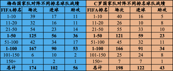 在1-100名的大区间里,梅西出场167次打入90球助攻53次,C罗出场166次打入91球助攻34次。两人对阵FIFA排名前100的球队,出场次数只差1次,进球差1球,梅西助攻多出近20次。