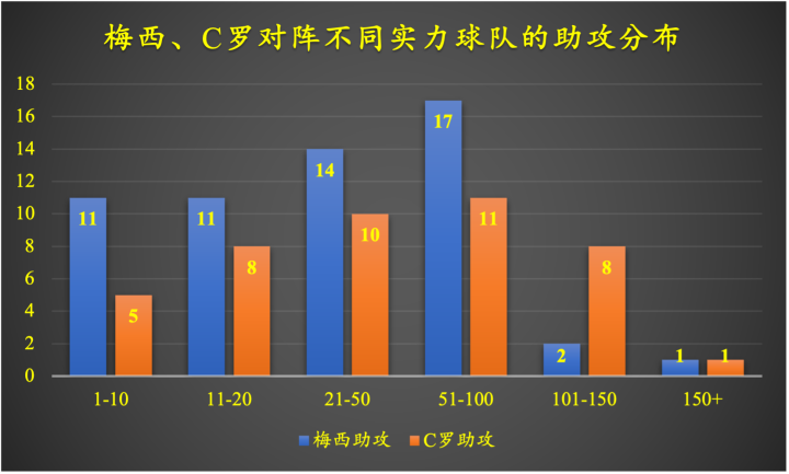 (图)梅西vsC罗——对阵不同排名的球队助攻分布