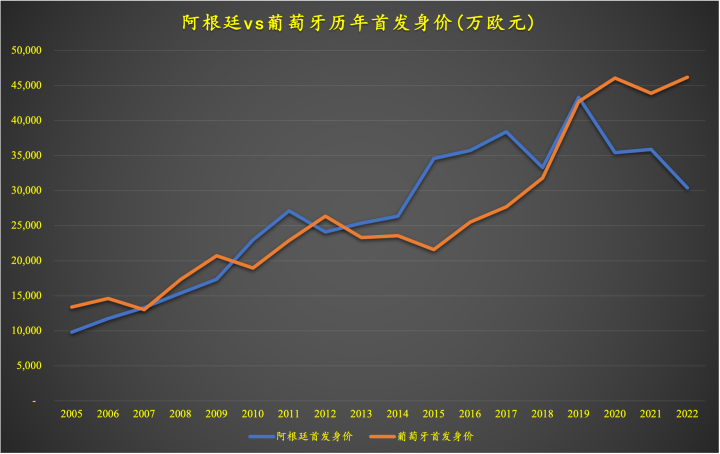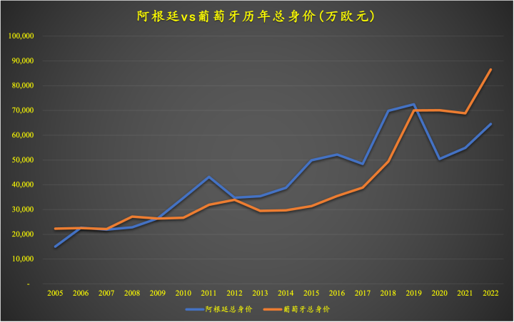 (图)阿根廷vs葡萄牙(剔除梅西和C罗)历年身价