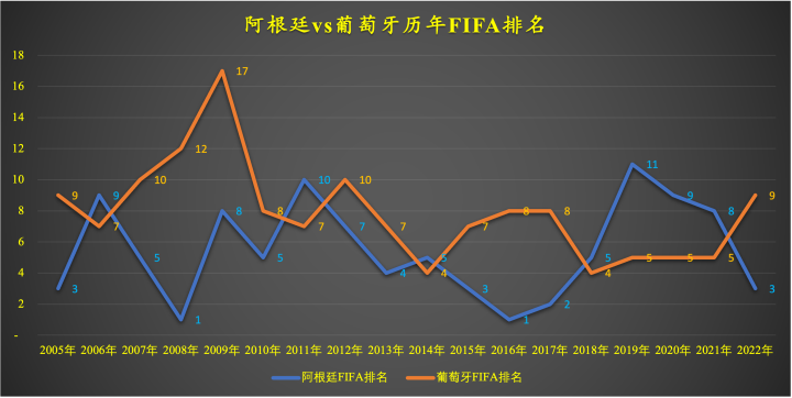 从历年的FIFA排名来看,阿根廷略高于葡萄牙。阿根廷的平均排名为6,葡萄牙的平均排名为8。从综合身价和FIFA排名观察,阿根廷确实略强于葡萄牙,但差距不大,两队都是世界级的强队。阿根廷赢得2021年美洲杯时FIFA排名第8,在赢得南美欧洲超级杯是排名第4,在赢得世界杯时排名第3;葡萄牙在赢得2016年欧洲杯时FIFA排名第8,在赢得欧国联时排名第5。并非身价越高排名越前才能夺冠。