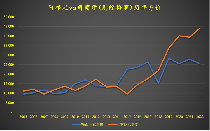 从身价看,前期C罗高于梅西,自2009年梅西则没低于过C罗。如果认可身价代表实力,那么梅西身价则较高。如果不认可身价代表实力,那么就不能断言阿根廷强于葡萄牙。这就成了悖论。那么不妨把梅西、C罗从首发身价中剔除,看看两人的首发队友的身价: