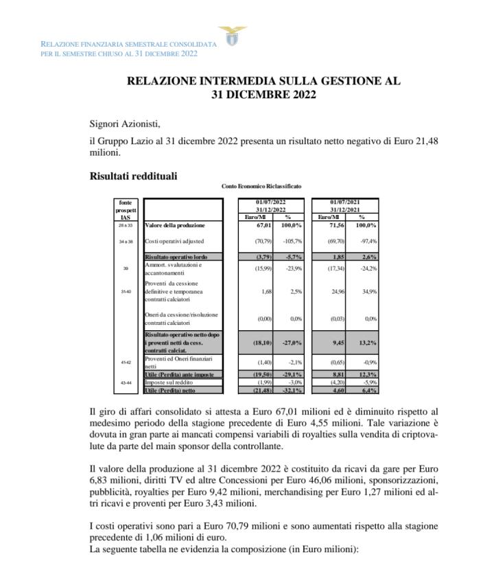 飞翔的蓝鹰拉齐奥俱乐部昨天公布了去年下半年的财务报告。