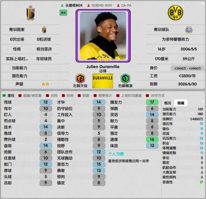 未满17岁的比利时妖星在精神上、身体上都尚显稚嫩,弱势的对抗成了拿球时的短板,处理球也不够合理,在游戏刚开始的一两个赛季未必能作为即战力使用。但如果成长不受阻碍,且随机潜力不低,迪朗维尔的短板能得到一定弥补,速度能力也会达到几乎满值的地步。