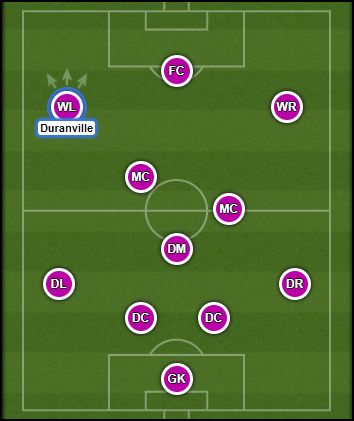 极高水平的爆发力和速度是迪朗维尔(杜兰维尔)突破对手的一大利器,14的盘带和技术也保障了他足够的脚下能力。迪朗维尔拥有典型的边路属性,能够在边路创造威胁禁区的进攻机会。